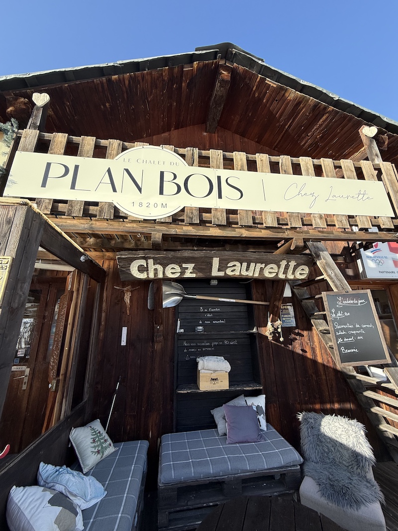 Chalet Plan du Bois. Ligging in skigebied Montchavin, onderaan skilift Ecureuils. Reservering aanbevolen voor de lunch, alleen telefonisch op +33 6 09 34 37 88