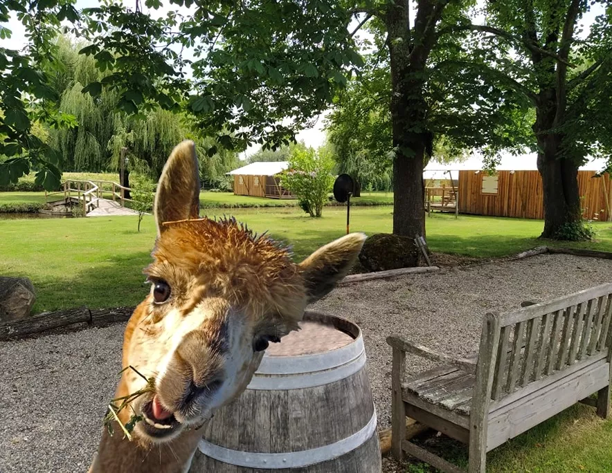 Brigitte, Don en hun 3 dochters begonnen in 2015 jaar een gezellig vakantiedomein in de zonnige Lot-et-Garonne, een avontuur dat is vastgelegd in 3 afleveringen van het programma Ik Vertrek. Ook hebben ze een alpacahoeve op hun landgoed: een geweldige extra attractie voor de gasten! Zo mogen gasten vaak meehelpen bij het voeren van de alpaca’s. en natuurlijk mag dan een leuke fotosessie niet ontbreken. Alpaca’s zijn heel nieuwsgierig en maken een prachtig hummend geluid, waar je helemaal rustig van wordt. Vanuit de lodgetenten en het terras van de studio’s kun je de dieren bovendien zien lopen: een prachtig uitzicht!