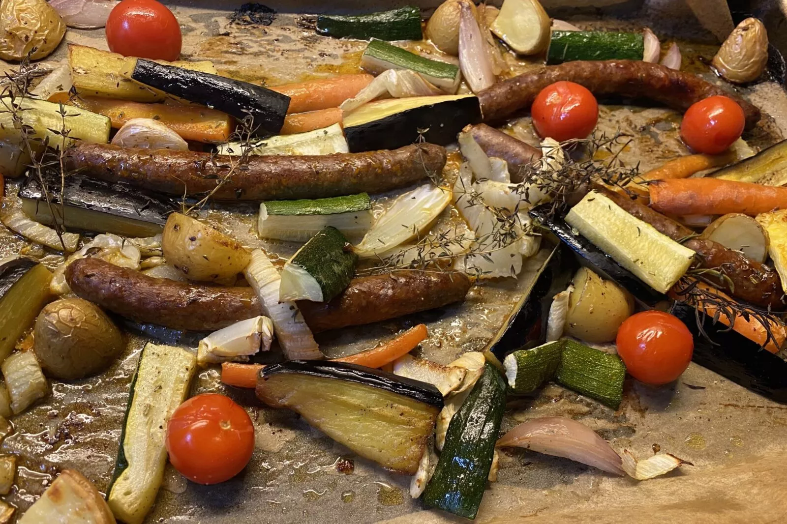 -Leg alles uit over de bakplaat, voeg ongepelde teentjes knoflook aan toe. Bestrooi met verse peper en zout. Leg de merguez verspreid tussen de groenten, besprenkel het geheel royaal met olijfolie en leg de verse takjes tijm erover. Bak in ca. 25 minuten gaar en voeg de laatste 10 minuten de kerstomaatjes toe.
